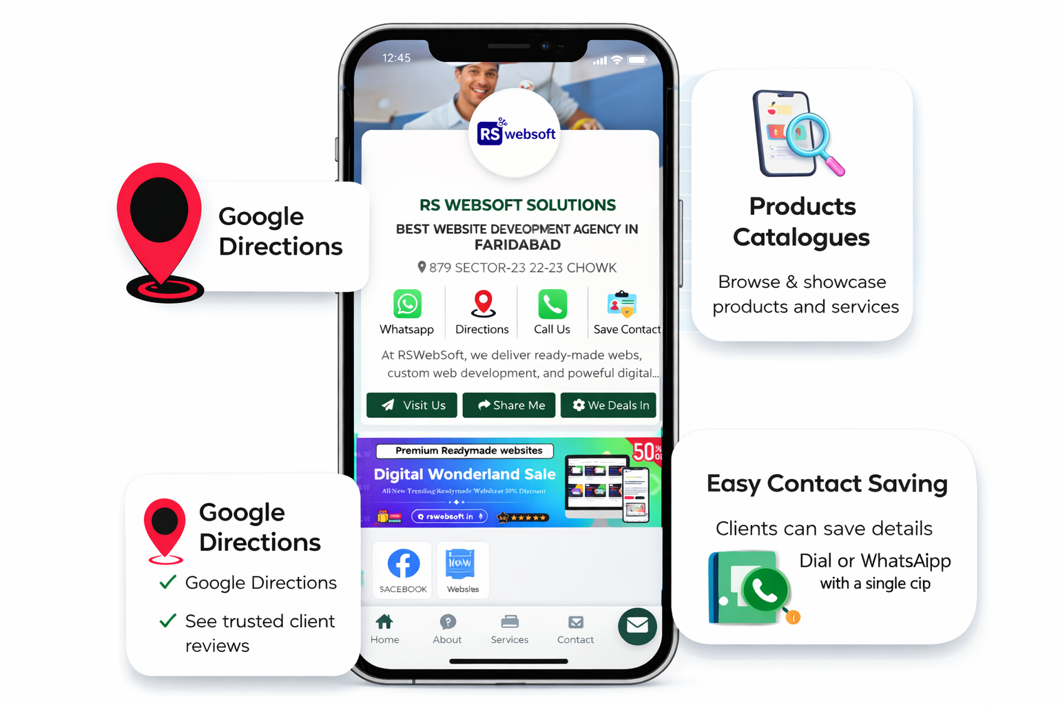 - Instant Customer Connection – One-tap access to WhatsApp, calls, Google Maps,Google Reviews and social media profiles.