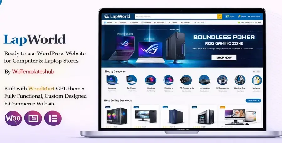 LapWorld is a modern Computer & Laptop Ecommerce WordPress Website Template designed for selling laptops, computers, accessories, and tech gadgets onl