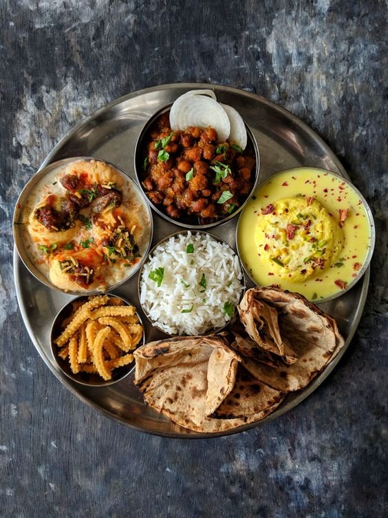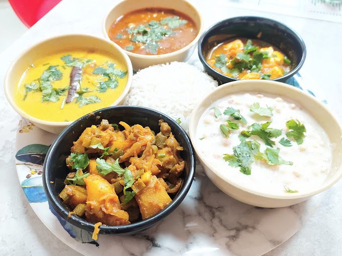 Delight in our comforting kadi paired with seasonal vegetables, soft roti, fragrant rice, and a crisp salad, creating a harmonious blend for veg thali