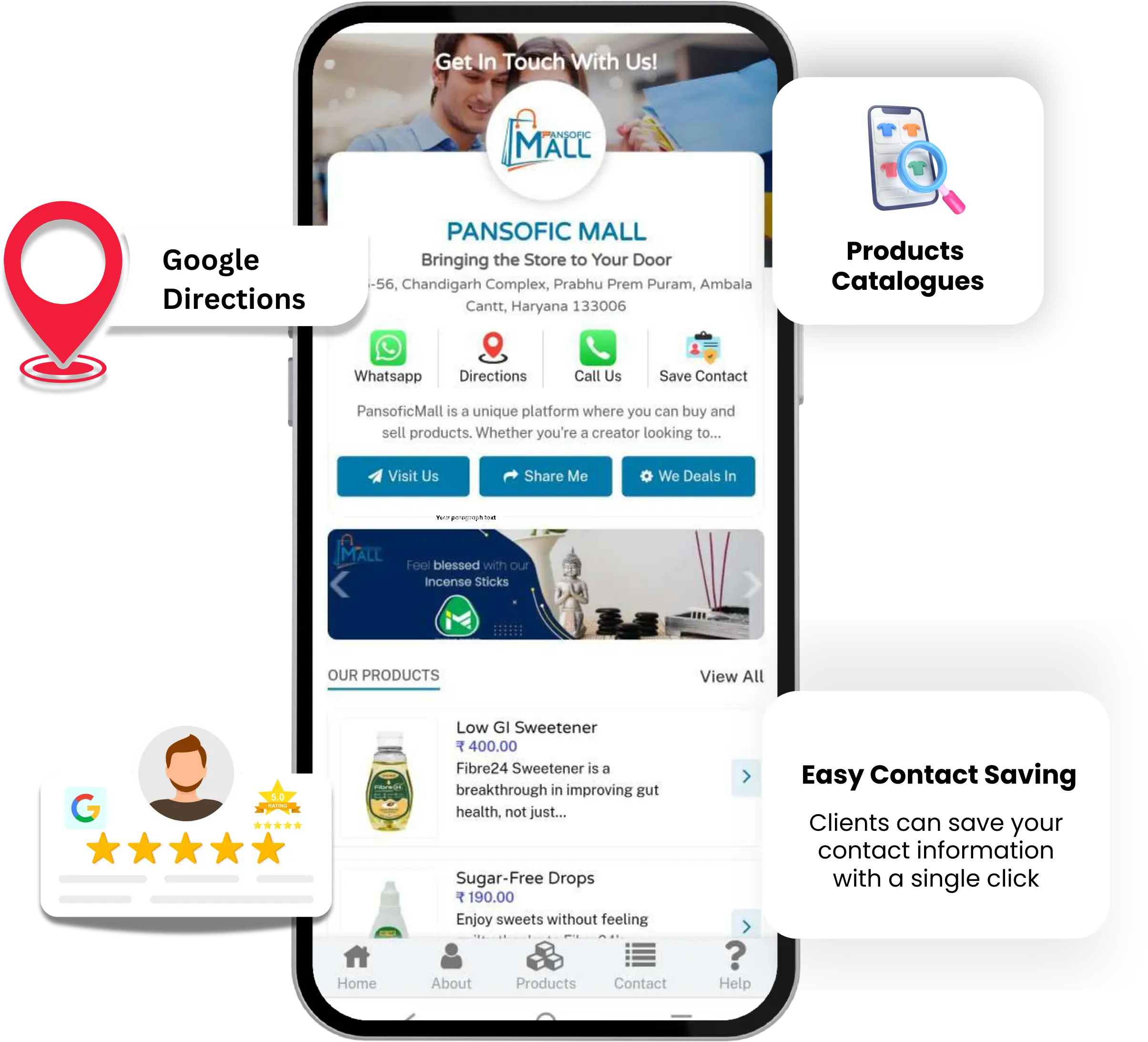 - Instant Customer Connection – One-tap access to WhatsApp, calls, Google Maps,Google Reviews and social media profiles.